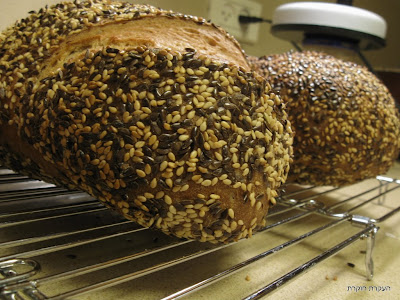 כפי שרבים יודעים, בביתינו מזה שנים לא קונים לחם! מאז שהבנתי שלחם הפומפרניקל השחום, האהוב על בעלי הוא בסך הכל לחם לבן עם תוספת צבע של קרמל שרוף אני אופה לחם לבד בעצמי וללא עזרת "אופה לחם". כהרגלי נכנסתי לעסק ברצינות והכנתי שאור על בסיס של תפוח עץ. מאז יש לי שני גורים דרך קבע במקרר מהם אני מכינה כל שבוע שלושה לחמים קטנים. המתכון הוא אותו מתכון שבבסיסו 400 גרם קמח רגיל, 300 גרם מהשאור ו-500 מ"ל מים, את הסטרטר הזה אני מערבבת עוד לפני הקפה של הבוקר (סתם עם מזלג, בקערה של המיקסר), עוטפת בשקית ומניחה ללפחות שלוש שעות תפיחה בטמפ' החדר. לאחרונה התחלתי להוסיף לסטרטר גם 2-3 גרם שמרים יבשים כך שהלחם יוצא עוד יותר אורירי. בשלב השני אני מוסיפה עוד 400 גרם קמח מקמחים שונים לפי מה שיש בארון ולפי המצב רוח. נגיד 100 גרם סולת, 100 גרם שיפון ו-200 גרם קמח מלא. בנוסף מתווספים כף סוכר חום וכף גדושה מלח, כעת המיקסר אהובי לש במשך כעשר דקות את כל הכבודה. בשלב זה מתקבל בצק רך ולעיתים נוזלי, תלוי במזג האוויר ובהקפדה שלי על הגרמים במשקל. כעת אני מעבירה את המסה למשטח סיליקון מקומח. ומכסה במגבת לחה. לאחר שעה אני מקפלת את הבצק לשניים ואז לשלוש: על הפעולה הזו אני חוזרת עוד פעמיים בהפרש של שעה מהקיפול האחרון. שעה אחרי הקיפול האחרון אני מחלקת את המסה לשלוש - לרוב לפי העין. גם פה עיצוב הכיכרות, תוספות - אגוזים/ זיתים/ עגבניות מיובשות/ תערובת גבינות או שומשום/ זרעים שונים ומשונים/ אגוזים כציפוי על הלחם, נבחרים לפי המלאי במקפיא/ ארון ועל פי מצב הרוח. הלחמים עוברים להתפחה על רשת פיצה, על שלושה נירות אפיה חתוכים (נייר אפיה נחתך ל-6 חתיכות), הככרות מכוסים במגבת ונשארים להתפחה בין שעה לשעתיים כתלות בלו"ז ובחום החדר.